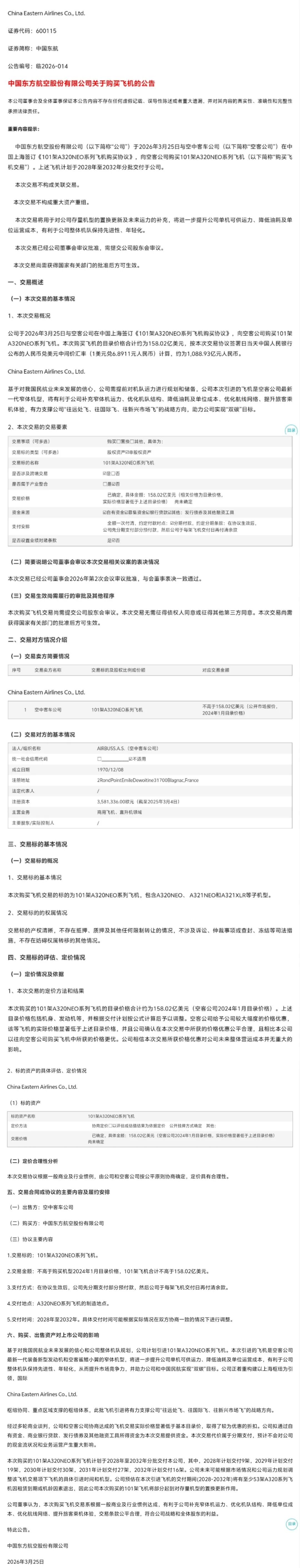 公司未来可能根据市场情况和公司运力规划调整该飞机交易项下飞机的具体引进时间和机型。公司预估在本次引进飞机的交付期间(2028-2032年)将有至少53架A320系列飞机因租赁到期或机龄因素退出,因此公司本次购买的101架飞机将部分起到对存量机型的置换更新作用。