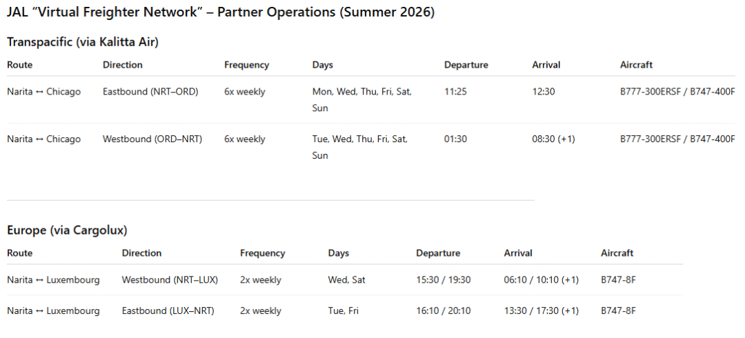 今年早些时候,日本航空与东日本旅客铁道株式会社(JR East)合作推出了一项服务,将日本的高速铁路网络与其国际货运业务相结合,使海鲜和药品等对时间敏感的货物能够从地方城市经东京转运至长途航班。这一服务不仅缩短了运输时间,还解决了日本国内供应链的结构性难题,包括司机短缺问题,同时提供了比公路运输更低排放的替代方案。综合来看,这些举措表明日本航空正进行明显的战略转变:与其大量投资于货机,不如构建一个“虚拟”货运网络。其最新的夏季货运时刻表也印证了这一策略。亚洲地区的货机运力基本保持不变,仅对台北和天津等航线进行了微调,这表明增长是通过合作伙伴关系和网络优化而非机队扩张来实现的。