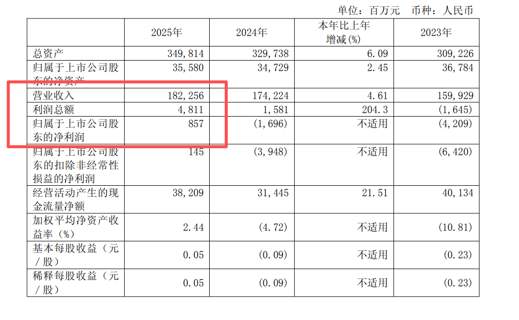 航空旅(FlightGlobal)消息,南方航空3月30日公告,2025年实现营业收入1822.56亿元,同比增长4.61%;归属于上市公司股东的净利润8.57亿元,上年同期亏损16.96亿元;基本每股收益0.05元。公司2025年度不进行利润分配或资本公积金转增股本,本次利润分配预案有待公司2025年年度股东会批准。南方航空 2025 年财报归属于上市公司股东的净利润 8.57 亿元,同比扭亏为盈,实现了疫情后首次年度盈利。